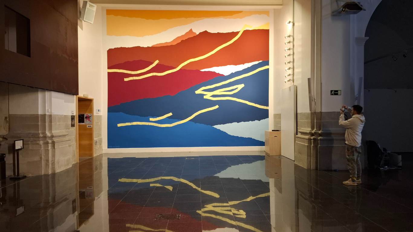También pasé tiempo con el archivo del centro y me llevé varios libros para empaparme de historia, tradiciones y antecedentes artísticos. Todos esos elementos terminaron entrando en la obra: desde la elección del título, que viene del habla local, hasta la paleta de color —en referencia a los diez territorios pirenaicos y a las comarcas de Huesca— o la línea amarilla inspirada en las fallas pirenaicas. Han sido referencias que han dado sentido y raíces al mural.