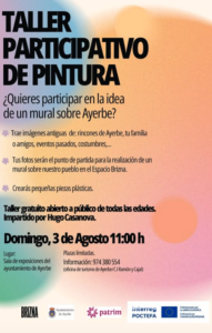 Como parte del proceso creativo, el domingo 3 de agosto se va a celebrar en la sala de exposiciones del Ayuntamiento un taller participativo abierto a todas las edades, en el que vecinos y vecinas crearán pequeñas piezas inspiradas en fotografías antiguas de Ayerbe. Estas obras servirán como base para el gran mural, que rendirá homenaje a la identidad y al patrimonio local desde un lenguaje artístico contemporáneo.