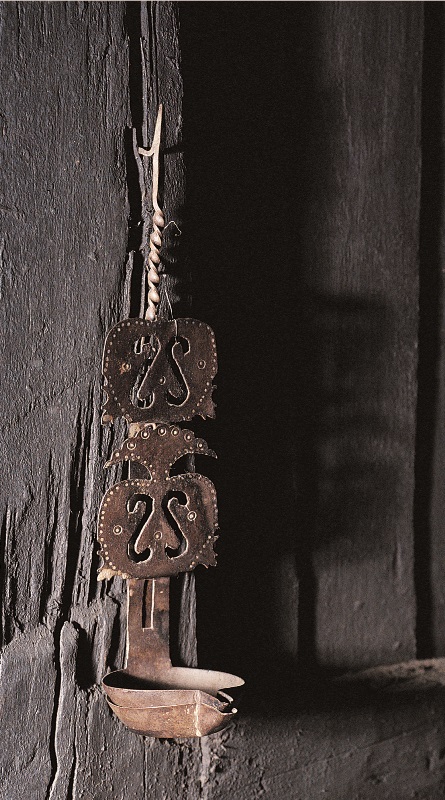 Candil de aceite con varilla terminada en un gancho afilado para colgarse de los postes de la casa.