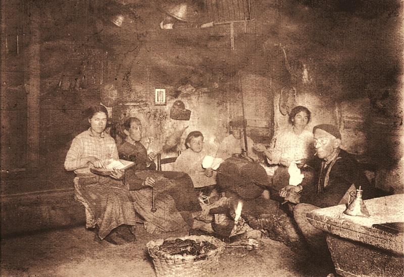 José Ignacio Mendiguren y Nicolasa Aramburu con sus hijos en la vieja cocina del caserío Igartubeiti hacia 1925.