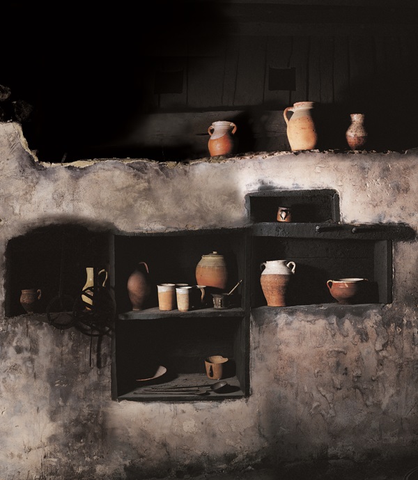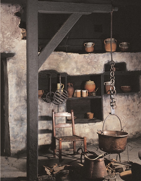 En la cocina se hallan varias alacenas o estantes -apalak- con marcos y repisas de madera empotradas en la pared en las que se guardan los platos de barro, peltre y madera, los pucheros, mantequeros, cuchillos de hierro, cucharas de palo, -zurezko kutxareak- botijas para guardar el aceite de ballena que servía para iluminar, aceitera, tinajas, cubiletes, jarrillas -antusiñe- y jarras -pittarra– de cerámica local.