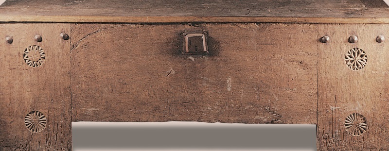 Arca del siglo XVI, con anchas patas decoradas con tachones y discos astrales.