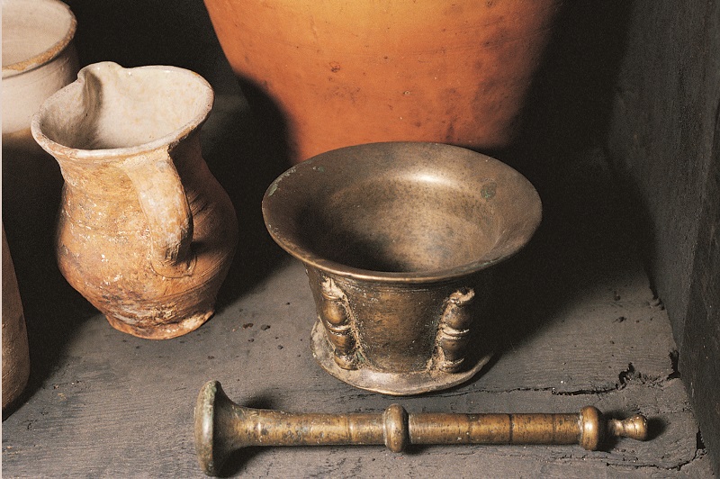 Otros utensilios que hay en la cocina son el mortero y el almirez -almaiza- de bronce que sirve para triturar o machacar ingredientes utilizados en las salsas y preparaciones culinarias.