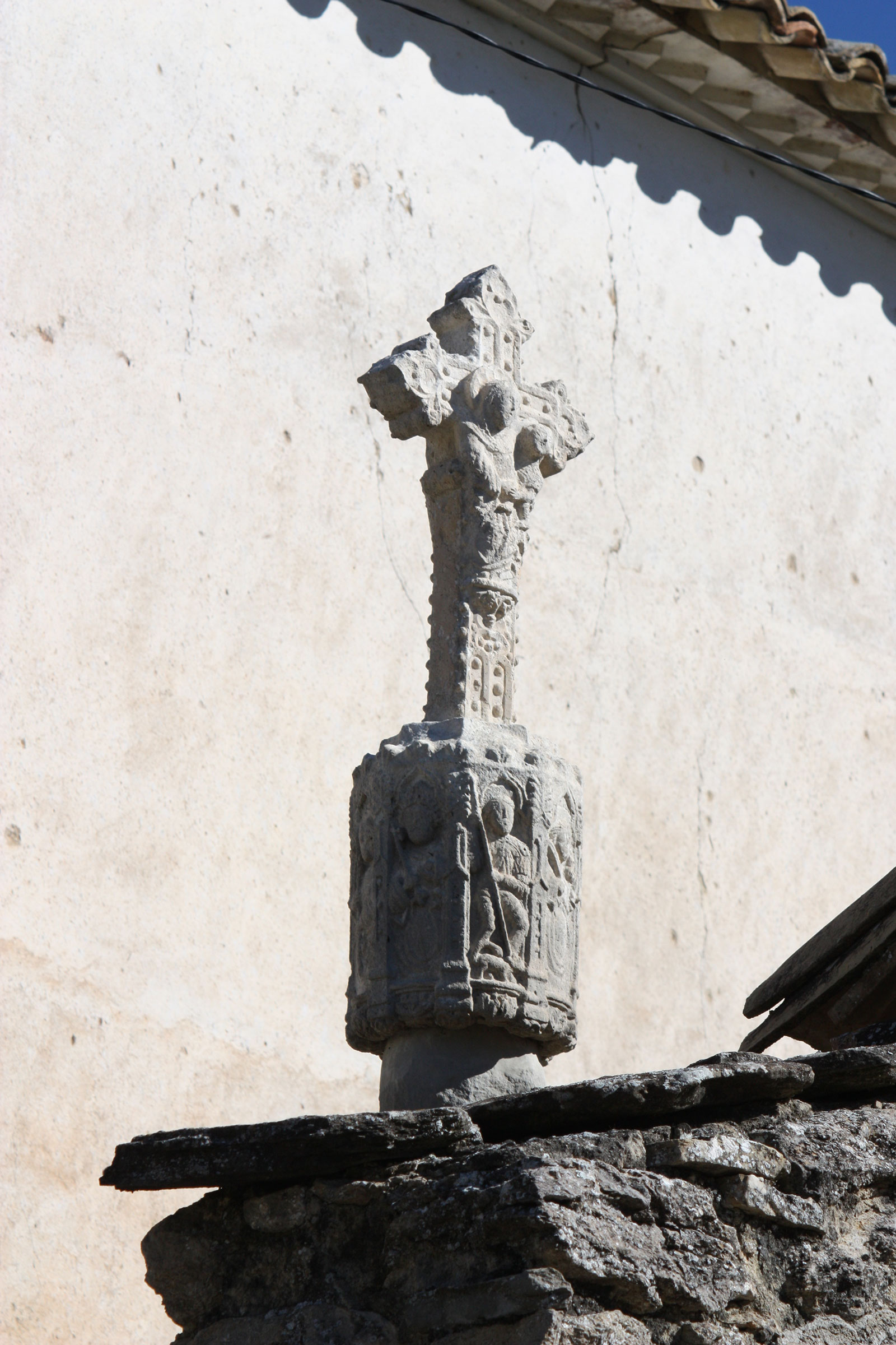 La cruz es flordelisada y de proporciones latinas, está recorrida por una decoración a base de bolas en sus esquinas facetadas y en sus frentes principales, donde se combinan con una tracería reticular que enriquece la presencia , respectivamente, de Cristo crucificado y la Virgen sosteniendo al Niño. El prisma inferior acoge a un reducido santoral, ocho imágenes cobijadas en sendas hornacinas de arquillos trilobulados sostenidos por pilastras de basa clásica, formada por toros y una escocia, y exterior adornado con las mencionadas bolas y pináculos de carácter vegetal. Finalmente, la disposición impuesta por el medio octogonal se repite en toda la parte inferior, labrada con motivos de cardina bajo los personajes y florales en las separaciones. El programa iconográfico presenta a un santo abad que ha sido identificado con San Victorián (báculo y hábitos monacales), a San Pedro, San Jorge, Santa Bárbara, Santiago peregrino y la tríada de arcángeles, Rafael, Gabriel y Miguel, sobre los que se sitúan Cristo y la Virgen María. La figura del octógono se puede interpretar como figura de intermediación entre la Tierra y el Cielo.