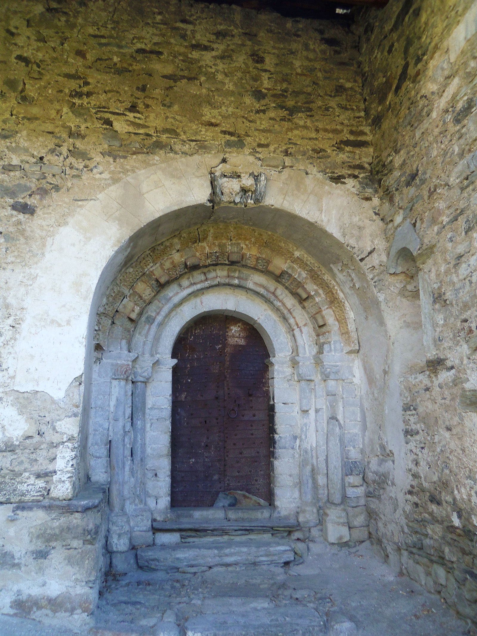 Destaca la puerta de acceso al muro sur, que presenta muchas similitudes con la decoración del templo de Sant Joan d’Isil. En este caso sólo tenemos tres arquivoltas y solo las dos interiores están apoyadas en dos parejas de columnas, con sus capiteles esculpidos.